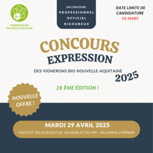 Le concours Expression Bio est un concours anonyme, accessible aux vignerons adhérents et non adhérents de Vignerons Bio Nouvelle-Aquitaine ! Un jury d’expert est sélectionné pour élire les meilleurs vins de la région. Les vins récompensés bénéficient d’une visibilité grâce à l’attribution de médailles d’or, d’argent et de bronze !